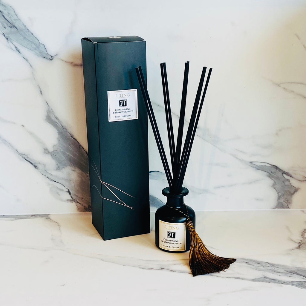 This is a Reed Diffuser set, including 10 bamboo reeds, 125ml Champagne & Strawberries diffuser oil or 250ml Champagne & Strawberries diffuser oil and one black diffuser bottle.