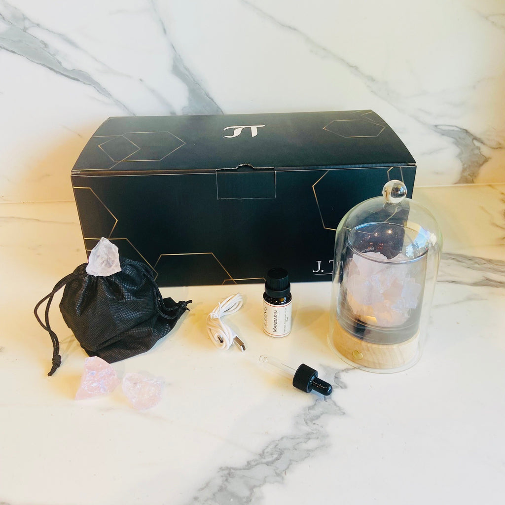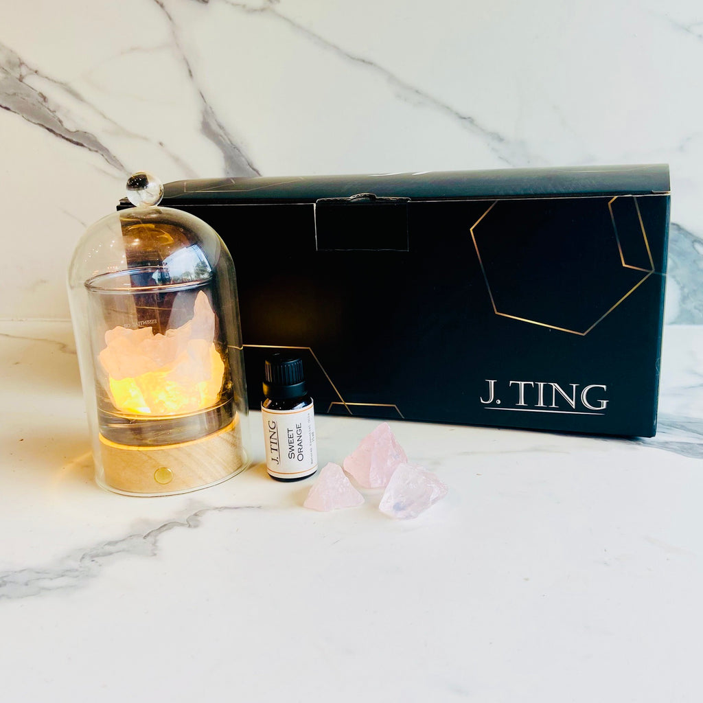 Experience tranquillity with our electric diffuser featuring natural crystals to enhance your aromatherapy. Simply add a few drops of the included mandarin essential oil to enjoy a soothing and uplifting fragrance in your space.