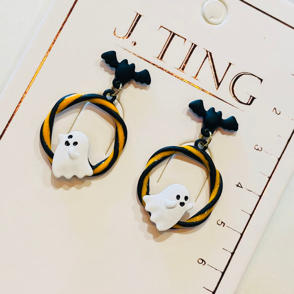 Let a tiny ghost float into your Halloween style! These playful earrings feature a little ghost soaring gracefully on a black and white spiral hoop, creating a fun and whimsical twist on a classic spooky accessory. Lightweight and eye-catching, they’re perfect for adding a touch of Halloween charm to any outfit—whether you’re at a party or just celebrating the season in style.