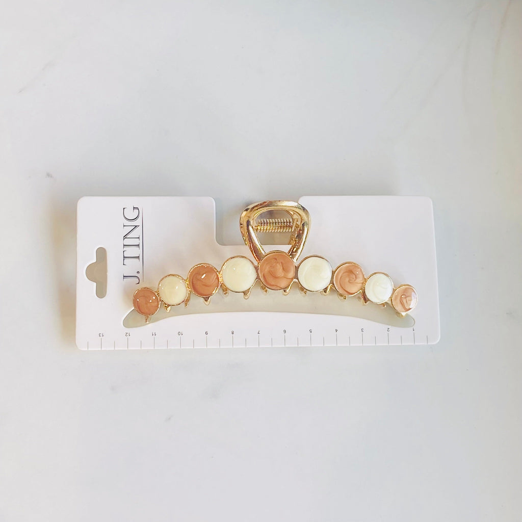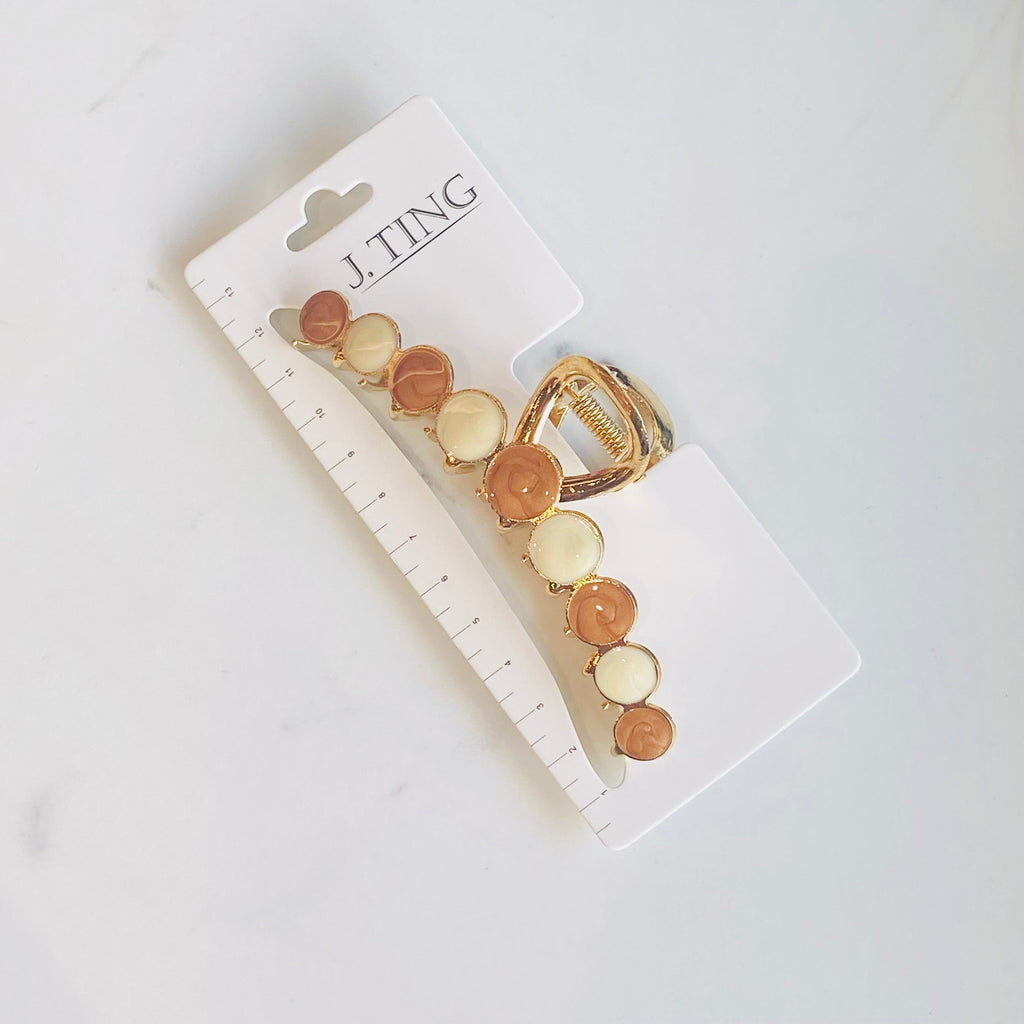 Add a touch of warmth and elegance to your look with this beautifully designed claw clip. Its arms are detailed with smooth, milky brown gradient circles, creating a soft and natural flow of earthy tones. The design is set against a rich brass-tone metal base, giving it a classic finish with a modern twist.